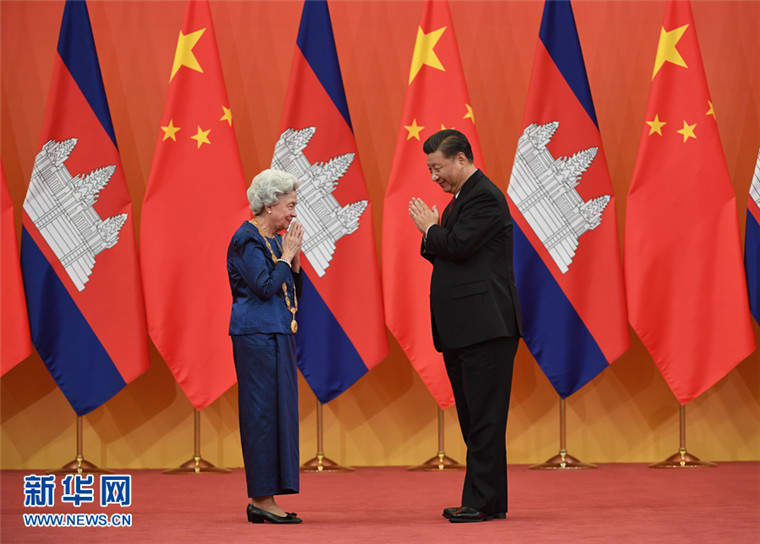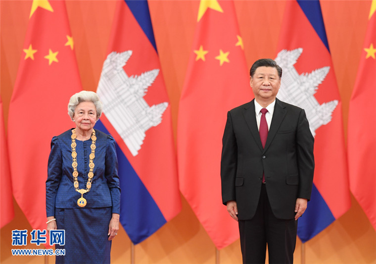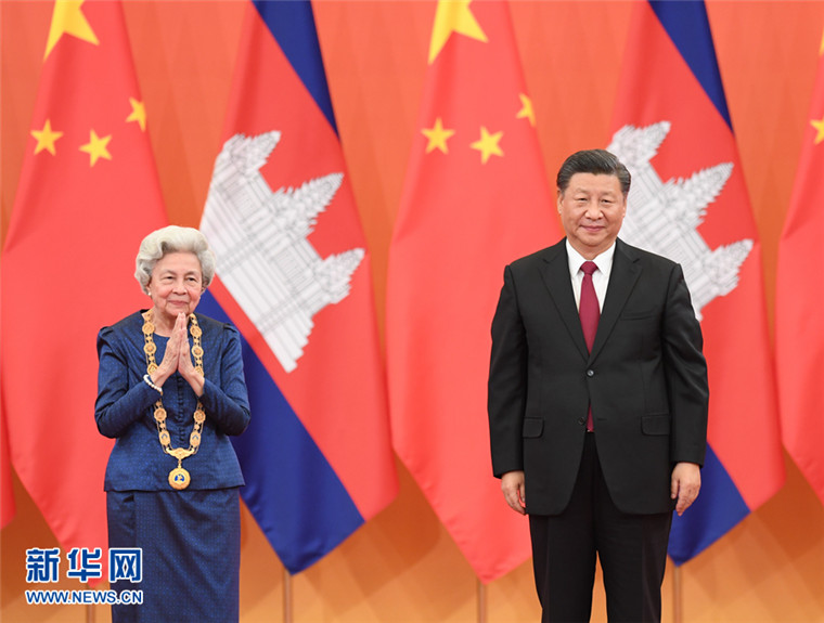 11月6日,国家主席习近平在北京人民大会堂为柬埔寨太后莫尼列举行中华人民共和国“友谊勋章”颁授仪式。 新华社记者 申宏 摄