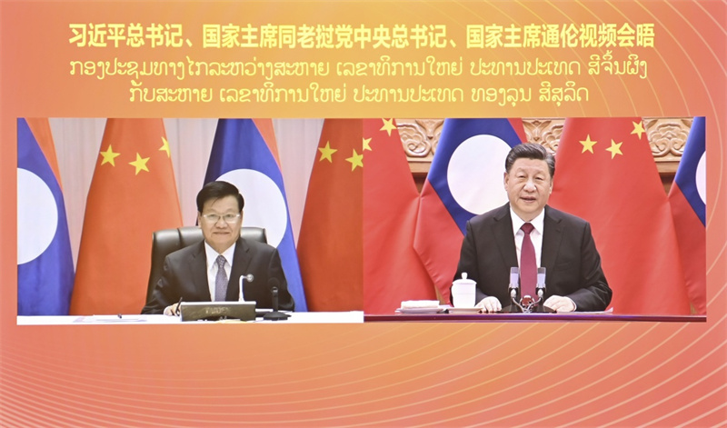 12月3日,中共中央总书记、国家主席习近平在北京同老挝人民革命党中央总书记、国家主席通伦举行视频会晤。新华社记者 李响 摄