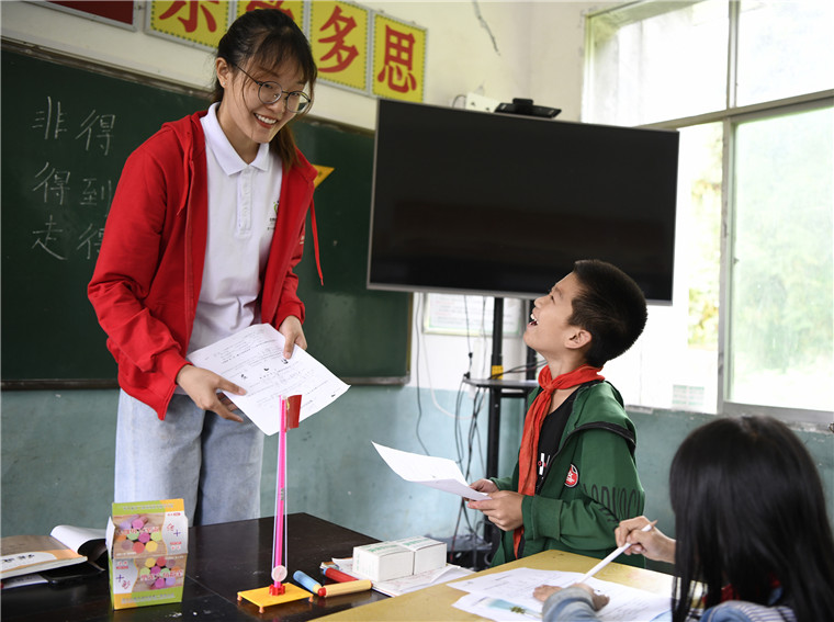在贵州省毕节市百里杜鹃管理区大水乡大石村大石希望小学,华中农业大学“本禹志愿服务队”第十六届研究生支教团成员陈倩雯在和学生交流(2020年9月9日摄)。新华社发(李华 摄)