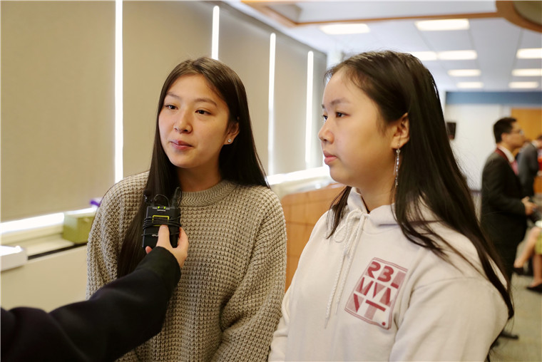 在美国伊利诺伊州北奈尔斯市,执笔给习近平主席写信的北奈尔斯高中一年级学生肯德拉·李(右)和参与写信的高中三年级学生塞雷娜·迈耶斯接受新华社记者采访(2019年4月3日摄)。新华社记者 汪平 摄