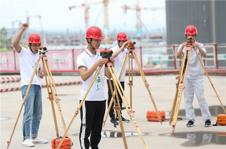 在四川成都天府国际机场T2航站楼施工现场,青年团员进行水准仪调校技能比赛(2019年4月29日摄)。新华社记者 江宏景 摄