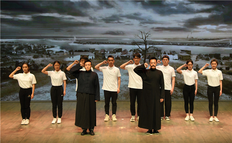 4月20日,在北京大学百周年纪念讲堂,电视剧《觉醒年代》陈独秀扮演者于和伟(前左)、李大钊扮演者张桐(前右)与北大学生同台演出。新华社记者 任超 摄