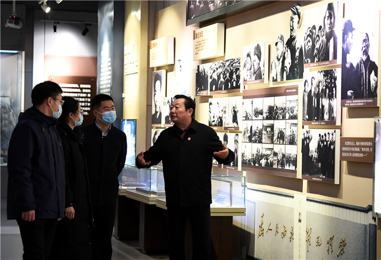 3月2日,焦裕禄纪念园干部张继焦(右一)在河南兰考县展览馆为参观者讲述焦裕禄的故事。新华社记者 郝源 摄