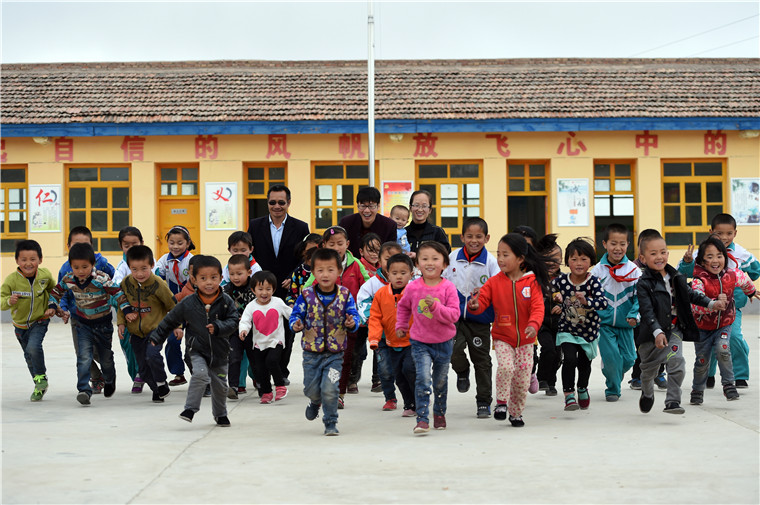 在甘肃省永靖县小岭乡土门村土门小学,校长鲜虎(中)带领全校师生合影(2018年4月26日摄)。在地处甘肃省永靖县城以西约50公里的干旱贫困山区,1989年出生的鲜虎和妻子蒲颜梅克服困难、忍受寂寞、坚守在教育教学第一线,为山区教育事业发展奉献青春年华。新华社记者 范培珅 摄
