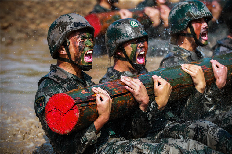 陆军第83集团军某旅红一连官兵进行体能训练(2018年6月22日摄)。新华社发(胡善雨 摄)