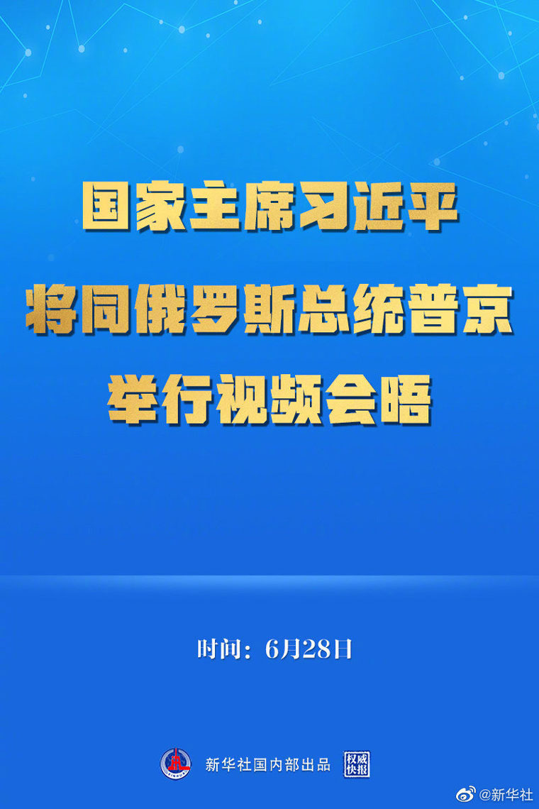 外交部发言人华春莹25日宣布:国家主席习近平将于6月28日同俄罗斯联邦总统普京举行视频会晤。