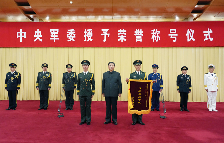 解放军报北京7月5日电(记者欧灿)中央军委授予荣誉称号仪式5日在京隆重举行。中央军委主席习近平向获得荣誉称号的单位颁授奖旗。