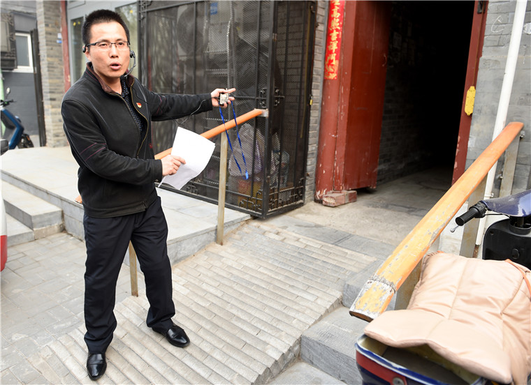 在北京市西城区,街巷长王俊礼在西河沿街218号门前介绍改造坡道、方便院内居民出行情况(2018年4月2日摄)。 新华社记者 罗晓光 摄
