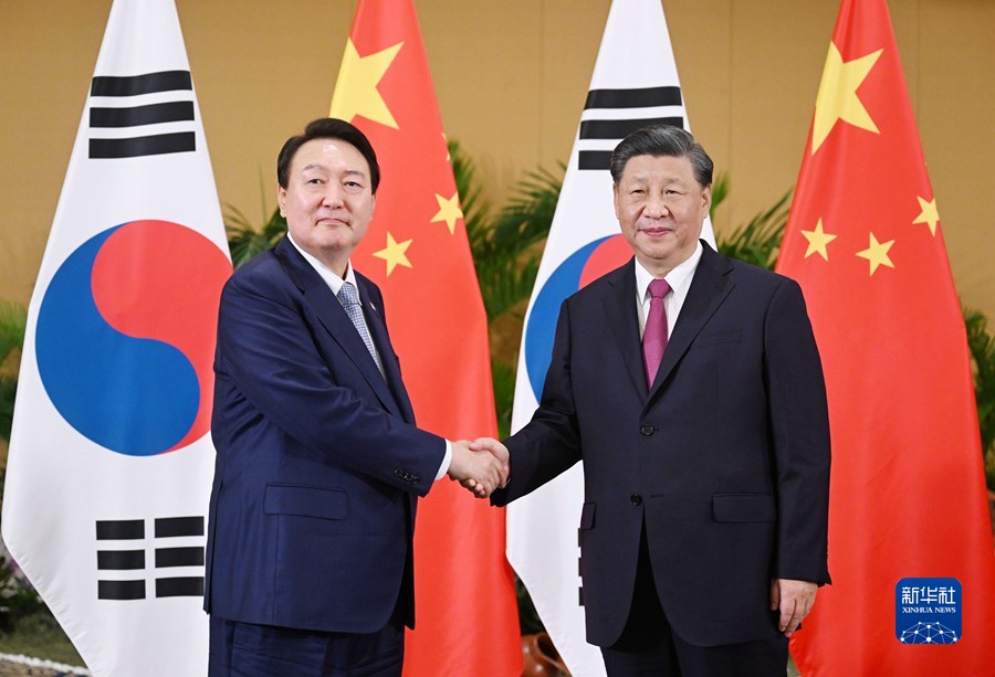 当地时间11月15日下午,国家主席习近平在巴厘岛会见韩国总统尹锡悦。