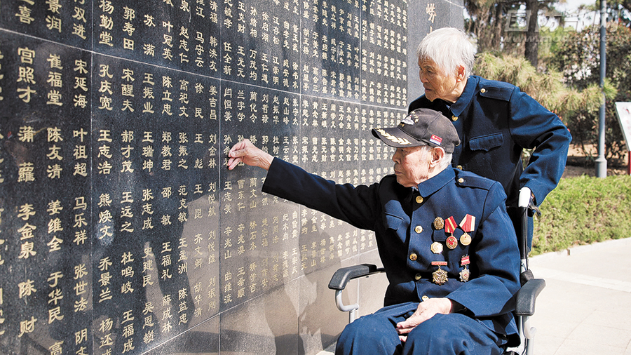3月26日,青岛市组织军民到崂山革命烈士陵园祭奠英烈。图为老兵杨志国、牟畏难夫妻在英名墙上寻找战友姓名。荣旻湜摄