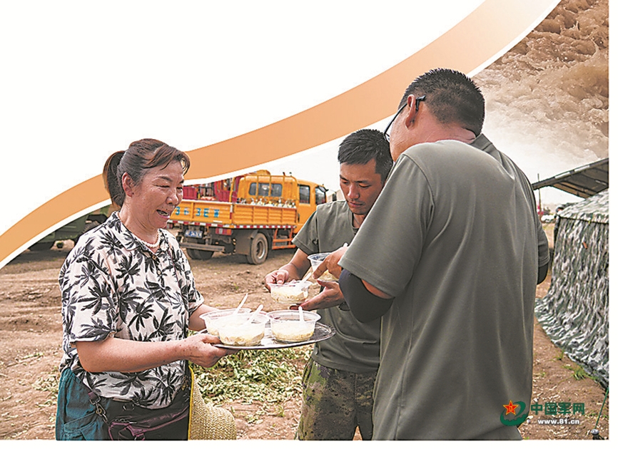 看着年轻官兵被晒伤的脸颊和满身的尘土,一位阿姨湿了眼眶。