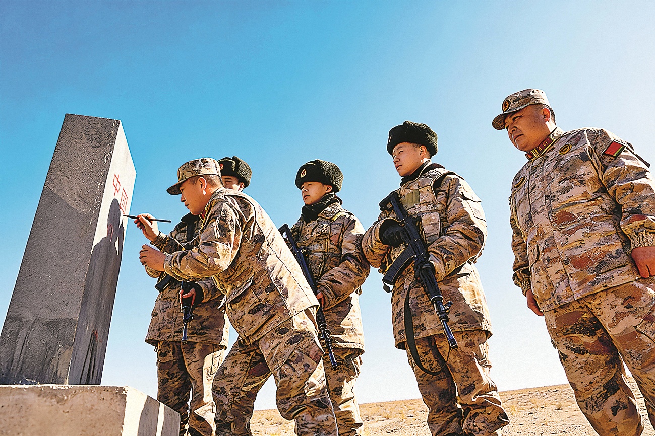 内蒙古乌拉特后旗民兵骨干与边防官兵联合巡逻途中为界碑描红。郭羽翔 摄
