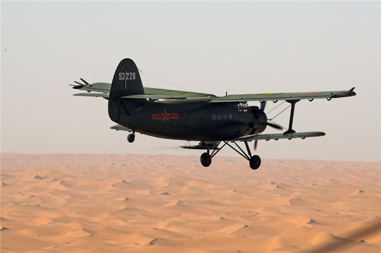 空军运-5B飞机在腾格里沙漠上空进行飞播作业。刘彦令 摄