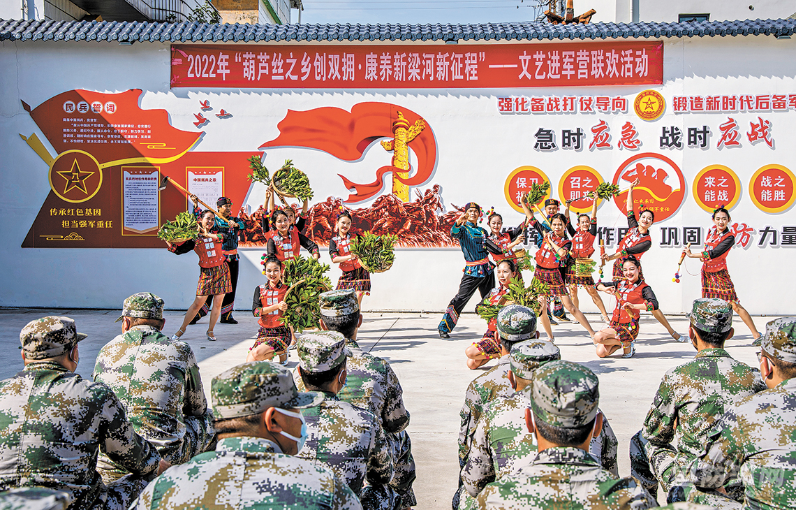 6月7日,云南省梁河县人武部、县文化和旅游局、县双拥办共同开展文艺进军营联欢活动,为正在集训的基干民兵送上“文化大餐”。李 顺摄