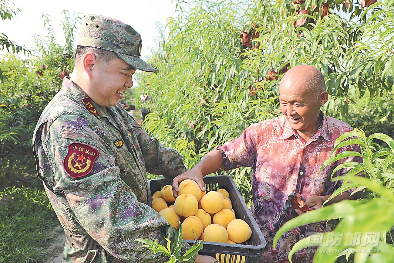 江苏省射阳县人武部组织民兵帮助果农采摘黄桃