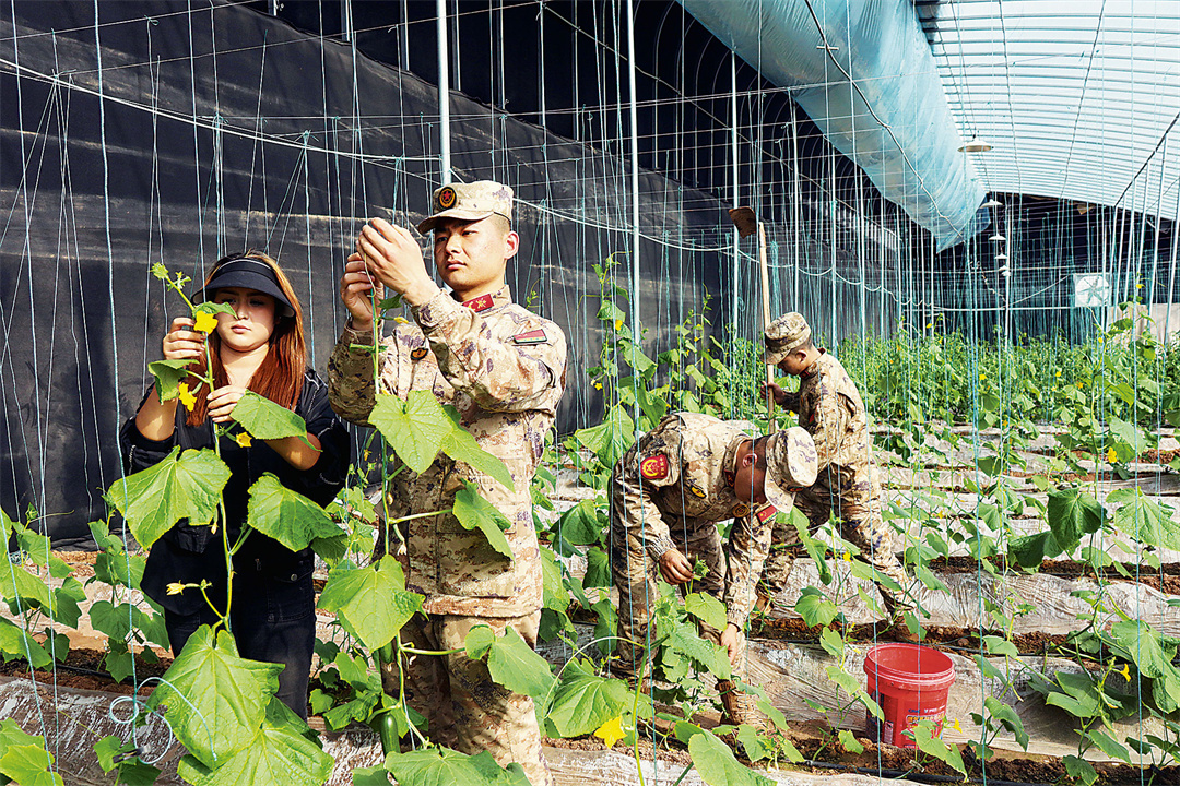 3月下旬,新疆柯坪县人武部组织民兵走进帮扶村温室大棚开展助农活动。