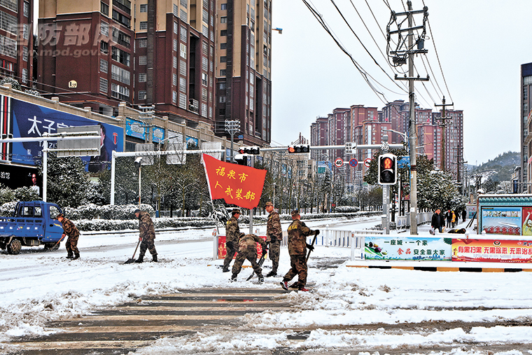 1月上旬,贵州省福泉市遭遇冰雪凝冻天气,市人武部第一时间组织民兵到高速服务区、高速路口、城市主要干道和主要路口清扫积雪,保证人民群众安全出行。图为民兵在主要干道路口清理积雪,恢复交通。梁正辉摄