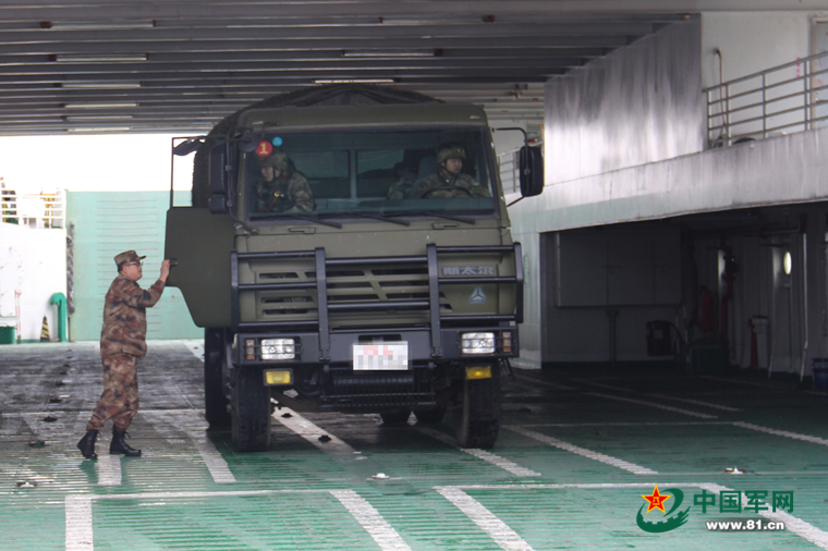 满载战备物资的军车开上民用客轮。房胤 摄