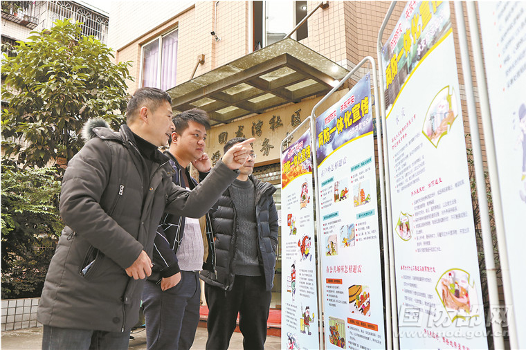 重庆市南岸区回龙湾社区居民观看人防宣传栏。王诚洁摄