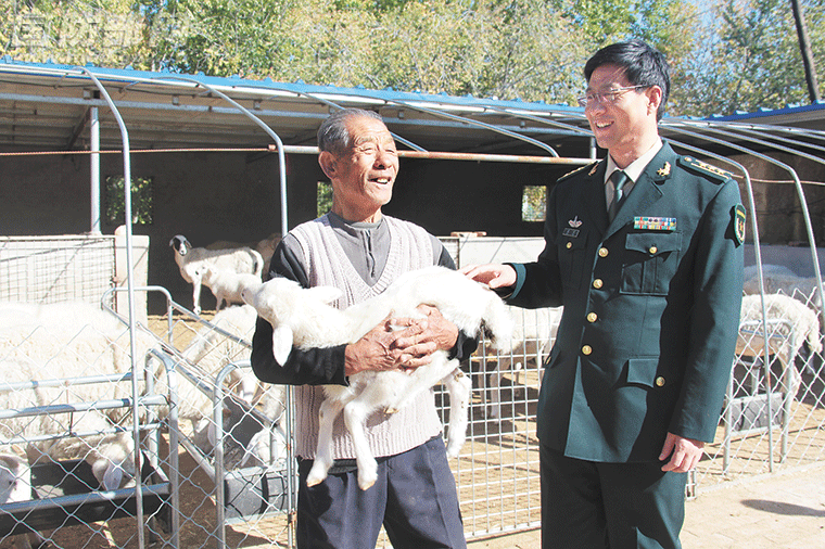 10月中旬,由辽宁省朝阳市双塔区人武部挂钩帮扶的十五家子村贫困户领取产业收益分红。图为人武部领导与贫困户王化仁分享养羊合作社产业分红的喜悦。单国军摄