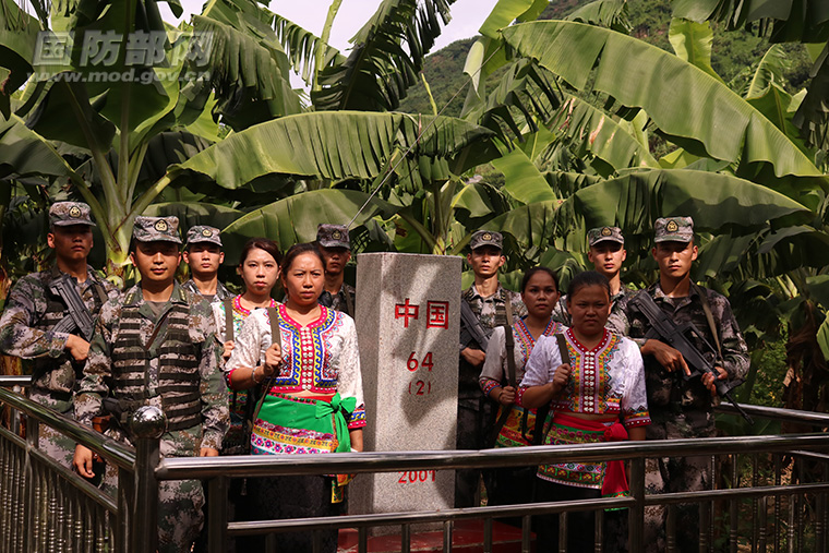 在边境地区,边民是强边固防的重要力量。图为云南省金平县金水河女子民兵哨队员与边防官兵完成巡逻任务后,在界碑前合影。 武路云 摄