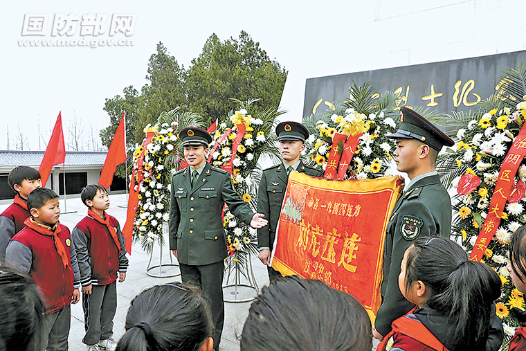 官兵在刘老庄连连旗前向学生讲述当年的战斗故事。