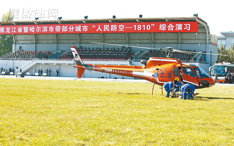 10月19日,黑龙江省人民防空指挥部在哈尔滨市、牡丹江市和鸡西市同步组织“人民防空—1810”综合演习。此次演习首次使用直升机进行空中救援,并动员信息防护分队开展消除电磁干扰等课目演练。