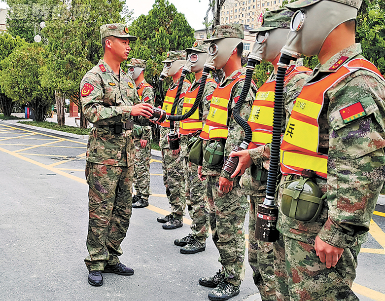 连日来,为提高民兵分队应急应战能力,甘肃省清水县人武部采取基地化轮训、重点课目强训、实战化演训等方式,严密组织基干民兵训练备勤。图为参训基干民兵穿戴防毒面具。