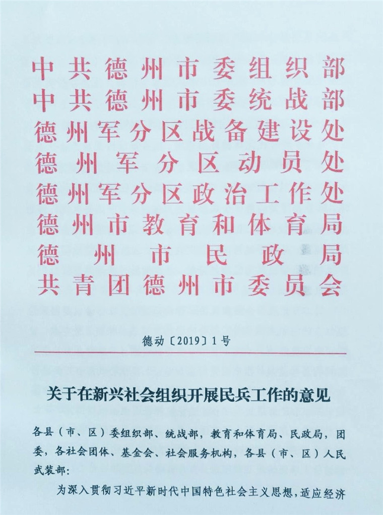 近日,为适应经济社会发展新形势和改革强军新要求,根据《兵役法》《国防法》《国防动员法》等法律法规和国务院、中央军委《我军后备力量“十三五”规划》精神,德州军分区动员处联合市委组织部、统战部等八部门出台了《关于在新兴社会组织开展民兵工作的意见》,该意见分为3大部分,共10条内容。
