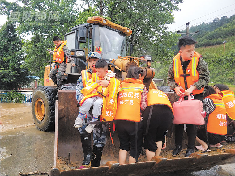 五月十日以来,湖南省绥宁县遭受暴雨袭击,七个乡镇沿河道路、房屋被洪水淹没。十一日,该县长铺子乡枫香学校七名教师、五名学生被困校内,县人武部接到县防汛指挥部救援通知后,立即组织民兵应急分队前往救援。