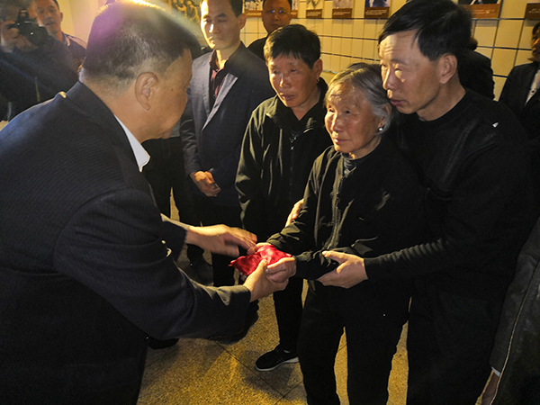 4月4日上午9时,在寻访团代表的陪同下,3位烈士的亲人来到平津战役纪念馆。在这里,他们举行了庄重简短的纪念仪式。平津战役纪念馆馆长王培军代表纪念馆全体人员分别为3位烈士的亲人送上滴满当年烈士鲜血和汗水的泥土。