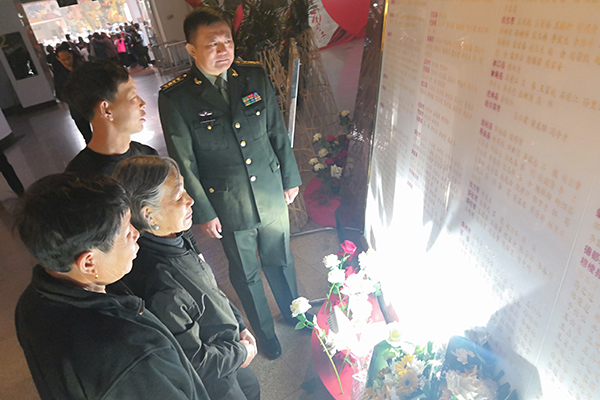 任宝发烈士的侄子任福存手抚英名墙上叔叔的名字动情地说:“叔,我来看你了。作为你的亲人,我很光荣很自豪。”