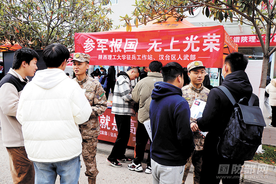 12月上旬,陕西省汉中市汉台区人武部工作人员来到陕西理工大学,利用校园招聘会时机开展征兵宣传,激励青年学子携笔从戎。