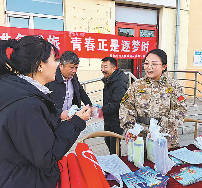 征兵宣传现场,工作人员向群众发放征兵文创冰箱贴。