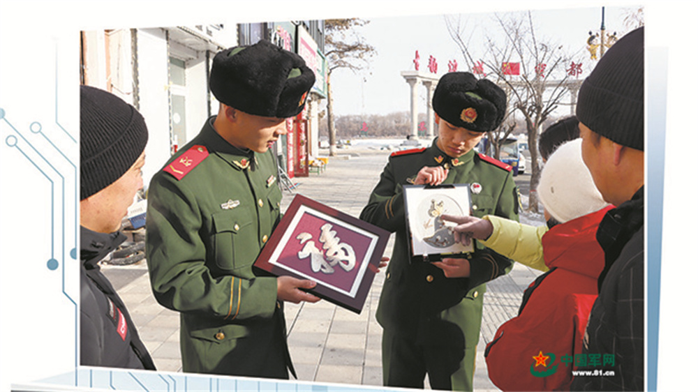 临近春节,武警双鸭山支队饶河中队官兵来到四排赫哲族村鱼皮画非遗传承人付占祥家,和村里的手艺人一起商议节前的鱼皮画销售计划。“可以做线上线下联动的展销活动,线上直播带货,线下设点销售。”战士孙明旭提出方案。