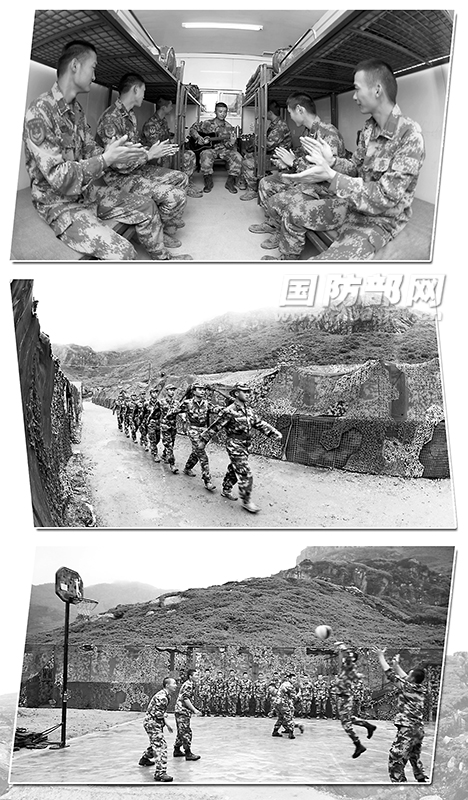 图①:官兵在“移动营房”内娱乐休闲;图②:官兵在驻训营区执勤;图③:又到周末,官兵在“移动营房”外开展篮球比赛。李文越 摄