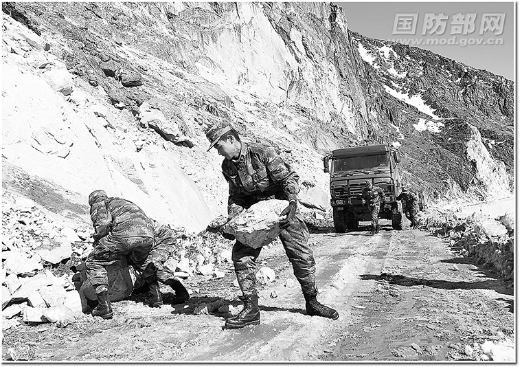 官兵在运输途中下车清理道路上的滚石。陈帝运 摄
