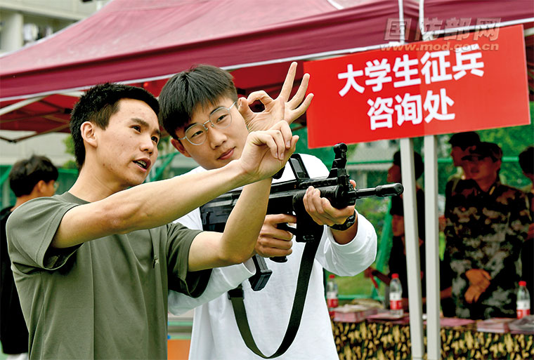 5月19日,江苏省2021届高校毕业生“百校千场万岗”就业招聘会在丹阳市举办。丹阳市人武部将征兵宣传展台“搬”进招聘会,开展征兵政策咨询,并举办兵器模型展览和轻武器知识介绍。图为人武部工作人员向大学生讲解轻武器射击技巧。