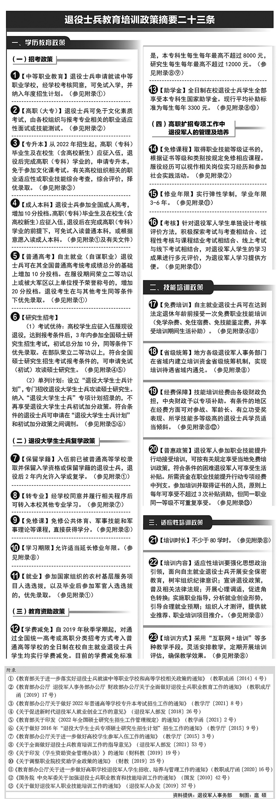近日,退役军人事务部归纳整理教育培训现行政策,印发《退役士兵教育培训政策摘要二十三条》,要求各地各级退役军人事务部门深入学习、熟练掌握,建立政策落实台账,加强宣传引导和检查督导,切实增强退役军人获得感、幸福感。
