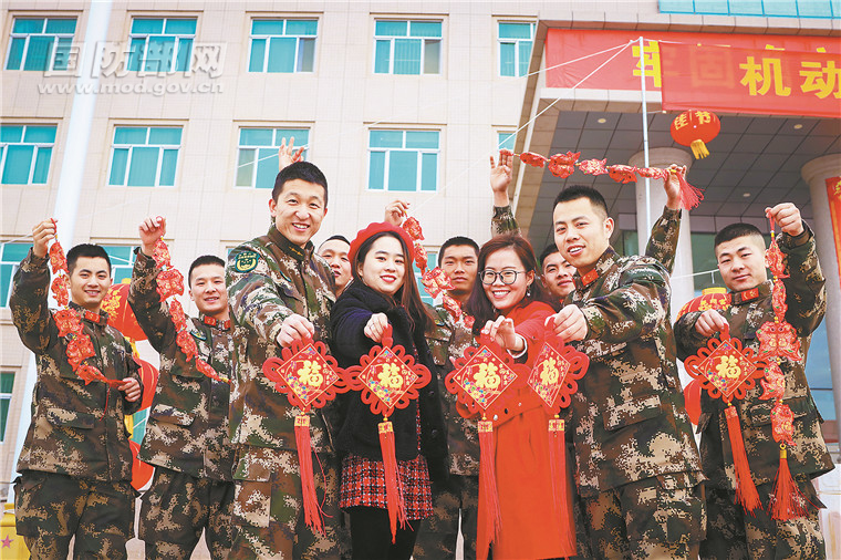武警新疆总队机动某支队来队家属与官兵一起装点营区,营造节日氛围。张剑 摄