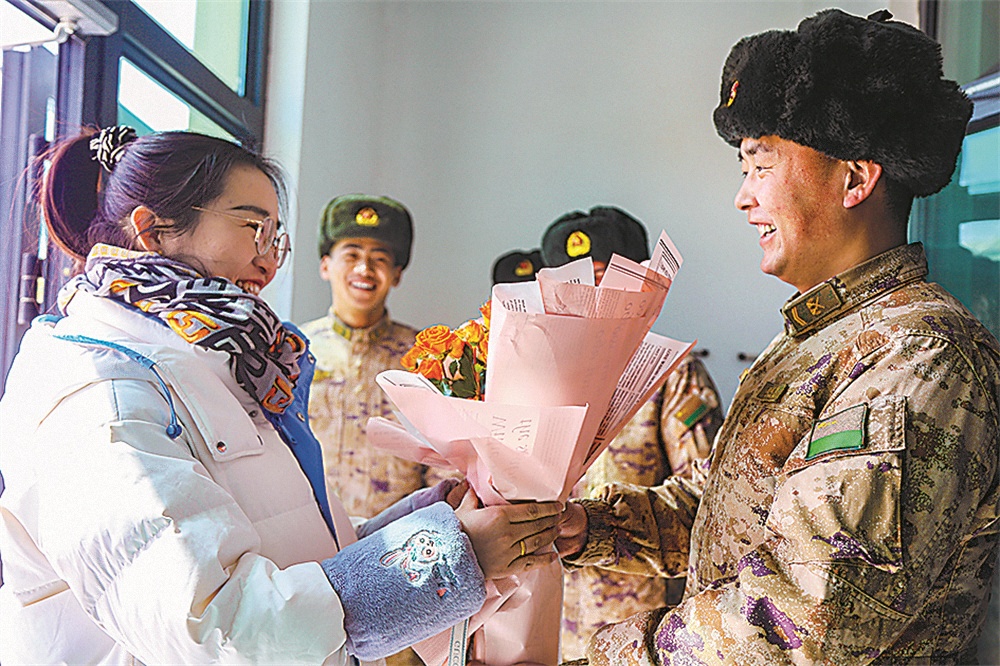 二级上士徐正兴在连队门口迎接妻子来队。李江 摄影报道