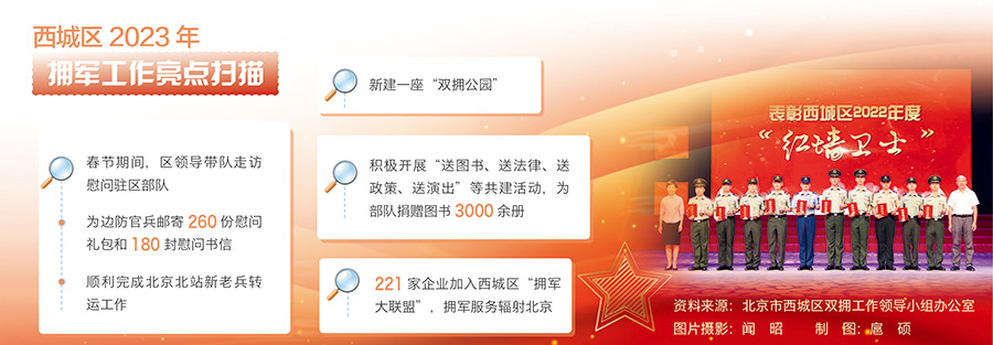 北京市西城区作为首都功能核心区之一,是党、国家和军队的不少首脑机关所在地,曾连续十次被命名表彰为“全国双拥模范城”。近年来,西城军民将践行“红墙意识”“柳荫精神”贯穿双拥全程,不断开创军政军民团结新局面,推动双拥工作创新发展、落地见效,以首善标准唱响新时代军爱民、民拥军、军民一家亲的鱼水新歌。