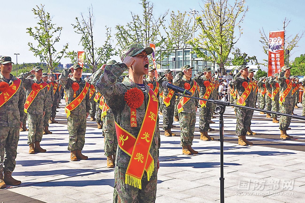 9月15日,江西省景德镇军分区举行新兵入伍欢送仪式,激励新兵扎根军营,刻苦训练,早日成为一名合格士兵。图为新兵宣誓。黄淑慧摄