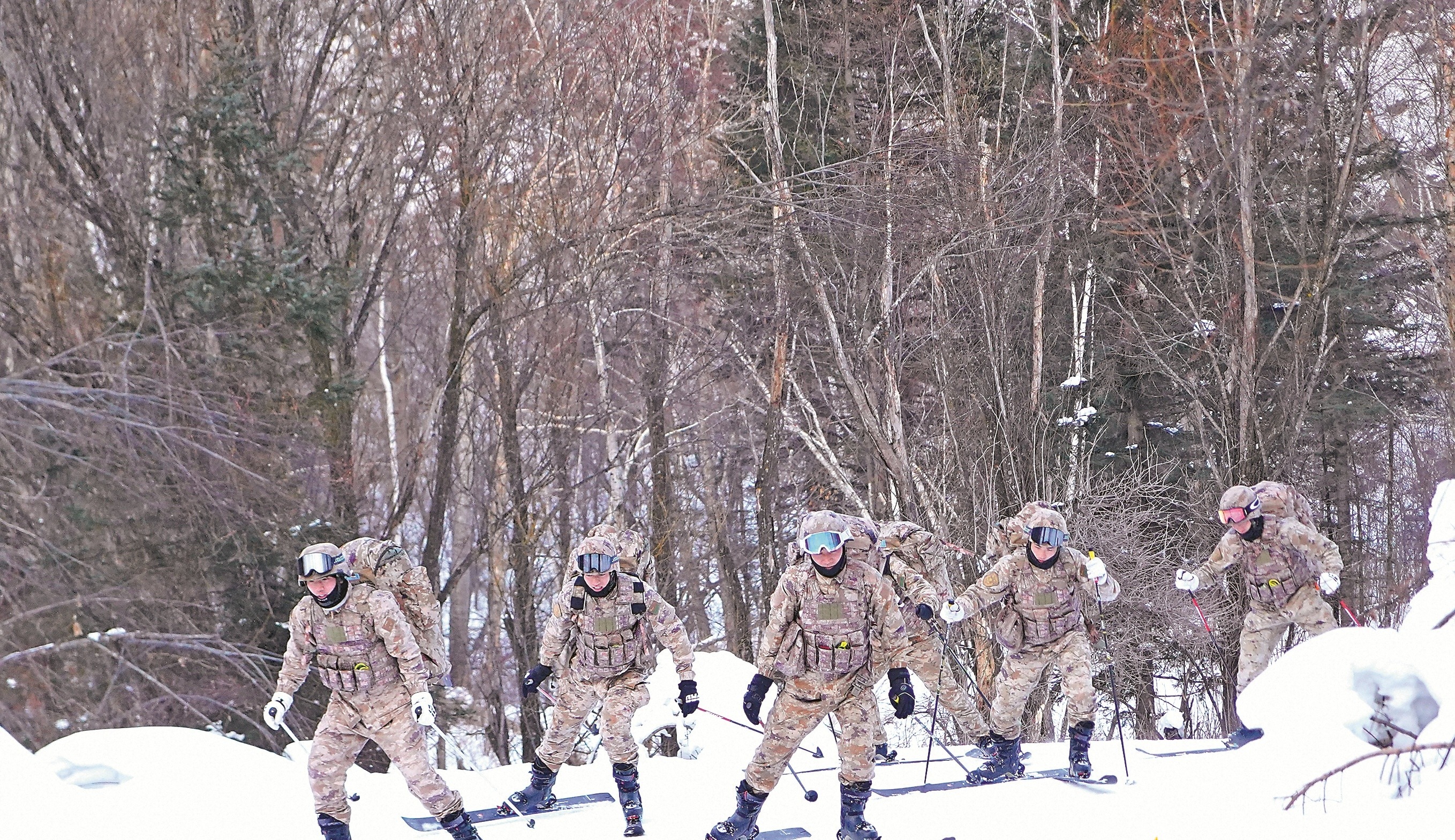 在教练员的带领下,新兵们一边喊着号子,一边学习滑雪的动作要领。在雪道的另一侧,不少经过反复摔打磨炼的官兵已经掌握了滑雪和滑冰的基本技术,练成了身手矫健的“雪上飞”。随着训练难度的增加,他们脚踏雪板,全副武装地进行滑雪训练,穿插进行负重行军、雪地搜救、据枪瞄准等课目训练,提升官兵对恶劣环境的适应力。