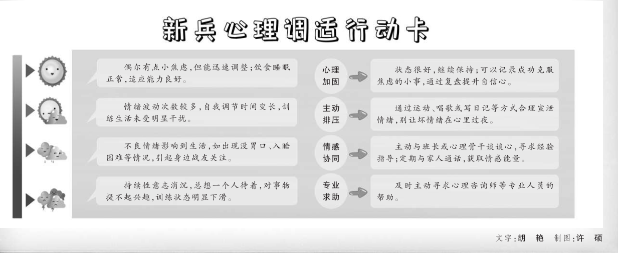 心理专家:小刘战友你好,你所说的“怕练不好”,很多新战友在训练初期都会经历。刚进军营,面对高强度、快节奏的训练生活,心里有些紧张是正常的。