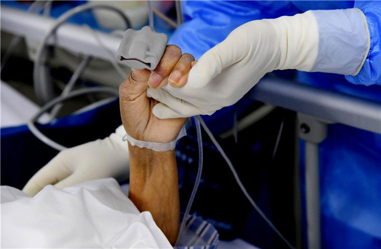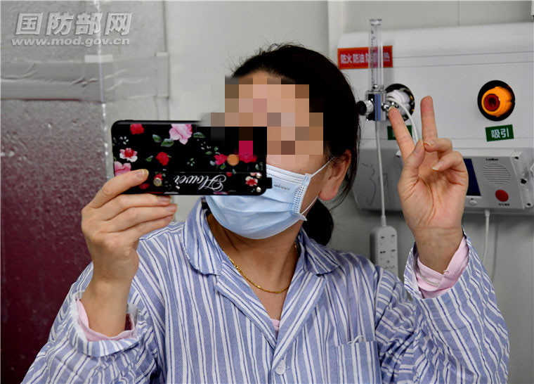 综合科的患者紧紧抓住医护人员的手,不愿意松开,千言万语道不尽对医护人员的感激之情。