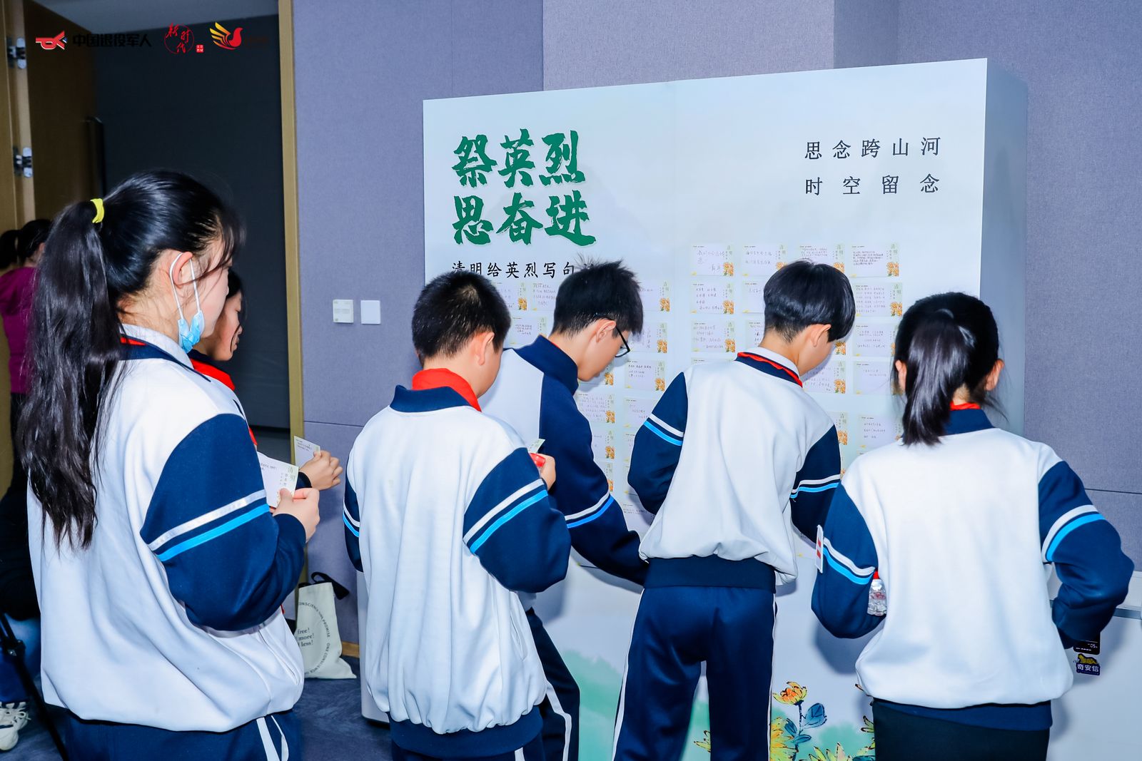 学生们将缅怀话语贴在“时空留念展板”上,表达对英烈的崇敬与追思。