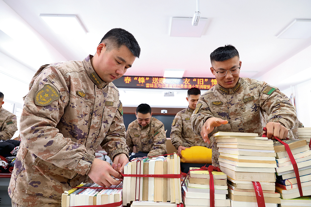 “雷锋班”所在连队官兵开展爱心助学活动。图为官兵捐赠图书。李东雪摄
