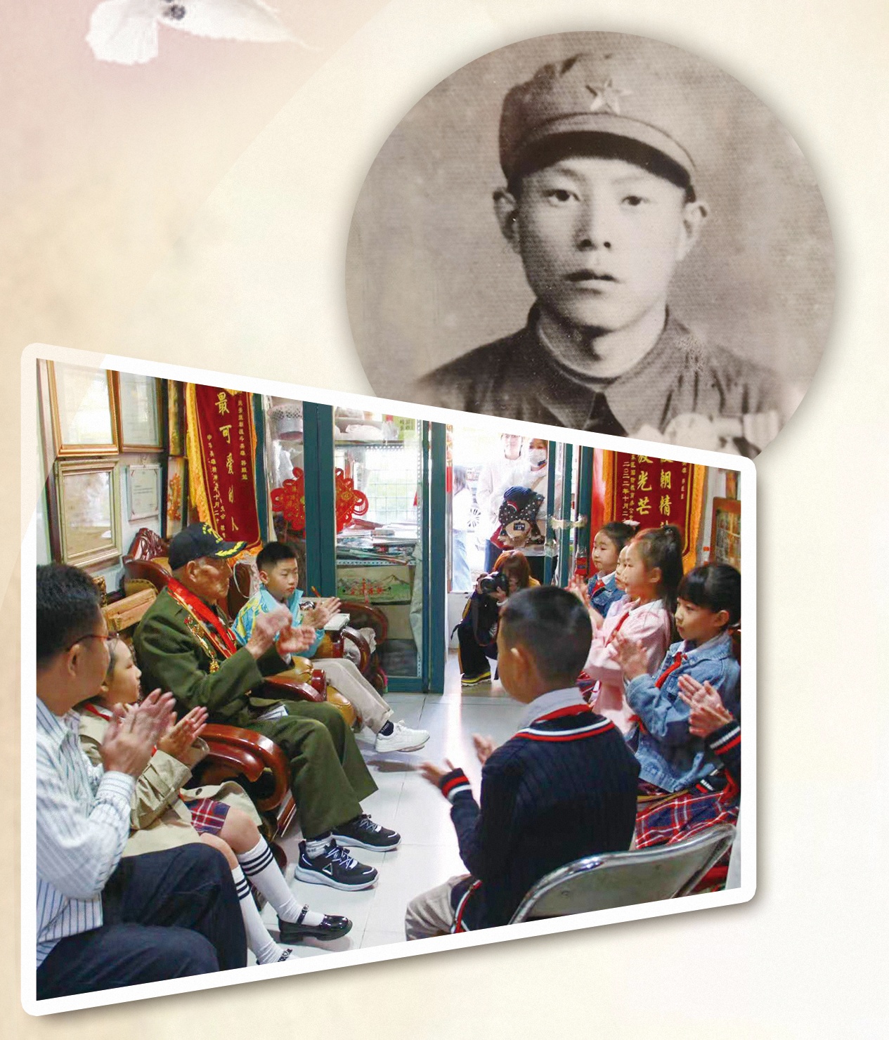上图:韩殿勉军装照。下图:韩殿勉为小学生讲述战斗故事。