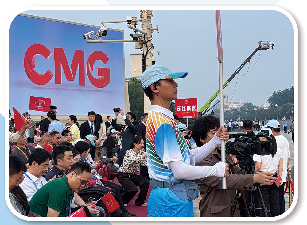 作为九三阅兵活动的志愿者,胡金超身姿笔挺地站在观礼台旁,当战旗方队护卫着荣誉旗帜经过天安门广场时,他感到无比自豪。
